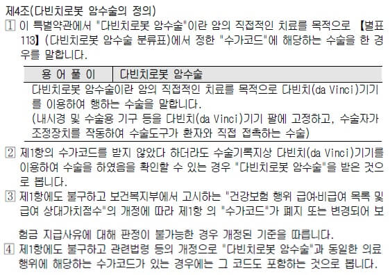 약관을 알아보기 이전에, 갑상선 암 다빈치 로봇 수술이 어떤 방법으로 이루어지는지를 알 필요가 있습니다.약관을 해석, 적용하는 데 매우 중요하니까요.[갑상선 암 다빈치 로봇 수술 방법]내시경 갑상선 절제술은 위치 때문에 사각 지대가 생기기도 하는데 이를 보완한 것이 바로 최첨단 로봇 수술이다. 로봇 수술은 내시경과 마찬가지로 옆과 유방 부위를 최소 절개하고 카메라와 로봇 팔을 넣어 수술한다. 로봇 팔이 여러 각도에서 움직일 수 있는 수술 부위를 다양한 각도에서 확인하고 절제할 수 있다.장· 연 우 교수는 주로 와키 쪽을 5cm이내에 절개한 뒤 갑상선 암 로봇 수술을 한다. 이 수술은 기존 로봇 수술과 비교했을 때 몸에 수술 자국이 거의 남지 않을 뿐 아니라 목의 유착, 불편감이 적어 신경 손상이나 부갑상선 기능 저하증 같은 합병증도 적다. 가끔 가슴 유두 쪽을 1cm미만으로 제거하고 갑상선 암 로봇 수술을 할 수도 있지만 이 수술법도 흉터가 거의 남지 않는다.[네이버 지식 백과]갑상선 암, 첨단 로봇을 통해서 정교하게 수술한다(고려대 의료원 건강 칼럼, 고려대 안산 병원)