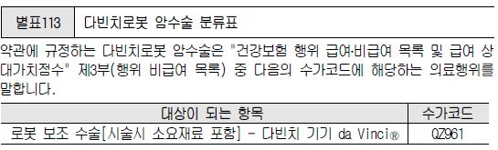 주 > 상기 1~85항의 수술 중 내시경을 이용한 내시경 수술 또는 카테터 등에 의한 경피적 수술은 86항을 적용합니다. 단, 복강경·흉강경 수술은 해당 부위 수술로 적용합니다.● 내시경 수술: 인체 내부를 특수의료기구를 이용한 직접 영상을 통해 보면서 하는 직접 치료 목적의 수술.(보험약관) ● 복강경하수술 : 복부에 내시경을 삽입하여 장기를 관찰하면서 그 일부를 절제하는 수술법. 담낭 위 대장 자궁 부신 림프절 등 장기를 개복하지 않고 절제할 수 있다. (생명과학대사전) ● 흉강경하수술 : 흉부내 내시경을 넣어 폐나 종격을 관찰하면서 폐의 일부 또는 림프절을 절제하는 수술. (생명과학대사전)☞’일반적인 상해 및 질병치료 목적의 수술’에서 복강경, 흉강경에 의한 수술은 내시경수술로 적용하지 않으며 해당 부위의 수술로 적용한다는 것은 복강경 하담낭 절제를 한 경우 86-2 내시경 복부장기 2종 지급에 해당하지 않으며 36번 담낭, 담도관혈수술(개복술을 수반하는 것) 3종에 해당한다고 합니다.세로수술비 ‘일반적인 상해 및 질병치료 목적의 수술’로 복강경, 흉강경은 관혈수술에 준하여 보상을 하는 것입니다.2. 악성 신생물 치료 목적의 수술수술명 수술의 종류 1. 관혈적 악성 신생물 근치수술. 단, 기타 피부암(C44)을 제외한다(내시경수술, 카테터/고주파전극 등의 경피적 수술 등은 제외한다.) 5종 1-1. 기타 피부암(C44) 3종 2. 내시경수술 3종 3. 상기 이외의 악성 신생물수술 3종주 > 1. 본소암, 경계성 종양에 대한 수술은 1. 일반질병 및 재해치료목적의 수술항목을 적용받습니다.2. 카테터를 이용한 흡인, 천자, 약물주입요법은 포함되지 않습니다. 3. 비고형암에 대한 비수혈적 근치수술은 관혈적 악성 신생물 근치수술에 준하여 5종 수술로 인정합니다.향하다.갑상선암 다빈치 로봇술이 어디에 해당하는지에 따라 종수술비 지급 결정 관혈적 악성 신생물 근치술로 볼 때 5종 내시경 수술이라면 (또는 기타 악성 신생물 수술이라면) 3종갑상선암 다빈치 로봇술이 어디에 해당하는지에 따라 종수술비 지급 결정 관혈적 악성 신생물 근치술로 볼 때 5종 내시경 수술이라면 (또는 기타 악성 신생물 수술이라면) 3종KISTI의 과학향 칼럼악성 신생물치료 목적약관 분류에서 관혈적 악성 신생물 근치수술을 5종으로, 내시경 수술을 3종으로 구분한 것은 일반적인 내시경 수술(위암이나 대장암 내시경 수술 등)을 구분하려는 것이지 정밀한 조작이 필요한 다빈치 로봇 수술을 염두에 두고 구분한 것은 아닐 것입니다. (암 제외) 일반적인 상해 및 질병 치료 목적의 수술로 신장, 방광, 신우 등을 복강경하수술로 한 경우 내시경 복부장기 2종이 아닌 해당 부위수술로 적용되어 4종으로 지급합니다.그보다 중한 암을 로봇술로 진행했으니 3종으로 지급하는 것은 종수술비의 종분류상 취지에 맞지 않다고 생각합니다.수술비 약관 해석 시 주의사항질병 수술비 약관을 씨 수술비 약관에 적용하거나 5대 기관/7대 기관의 수술비 약관을 씨 수술비에 적용하고 주장하는 것은 설득력이 없습니다.5대 기관 수술비 7대 기관 수술비 약관에서는 비 수혈 수술을 명확히 정의합니다.비 수혈 수술은 내시경 수술, 카데터 수술, 새 의료 수술의 일입니다.내시경 수술에서 대뇌 내시경, 복강 경하 수술, 흉강 경하 수술은 제외됩니다.이 3개의 수술은 관 혈액 수술에 준하여 보상합니다.( 이렇게 구분하는 데에는 이유가 있습니다. 나중에 기회가 있으면 5대 기관 수술비 7대 기관 수술비 약관 포스팅에서 설명하겠습니다.)이와 달리 세로 수술비 약관에서 대뇌 내시경 수술을 3종으로 구분하면서 이를 두개 내 관 혈액 수술 5종으로 보긴 어렵다는 것입니다.그러므로 해당 약관의 내용은 수술비 지급 판단 시 중요한 근거가 됩니다.다만, 약관이 동일하더라도 보험 회사 방침상별로 지불하는 경우도 있습니다.갑상샘암 다· 빈 치로봇토술을 3종으로 보거나 5종으로 보일지는 이런 경우에 해당한다고 말할 수 있습니다.3종으로 보는 논리가 무리하기보다는 5종으로 보고 지급하는 보험 회사의 보상 방침이 좀 더 유연하게 적용된다는 것이 옳은 것 같습니다.보험사는 보험금 지급 사유가 발생하기 전에 보험금 지급 관련 문의를 하겠다고 대답을 회피하기도 한다는데, 다빈치 로봇 기술에 관해서는 각 보험사별로 지급 방침이 마련된 거니까(나중에 보험금 청구시에 옥신각신하다보다는 낫죠.)사전에 확인하고 담보를 선택하는 것도 검토할 가치가 있습니다.[함께 보면 도움이 된 글]● 다빈치 로봇 기술을 세로 수술비로부터 불량 지급한 청탁도 있었습니다.다빈치 로봇수술 시 질병종 수술비 미지급에 대응하는 법 다빈치 로봇수술은 로봇 복강경 시스템 중 가장 대표적인 수술방법입니다. 내시경수술이란, 하나 또는 복수의……blog.naver.com위 내용은 모집종사자 개인의 의견이며, 계약체결로 인한 이익 또는 손실은 보험계약자 및 피보험자에게 귀속됩니다.