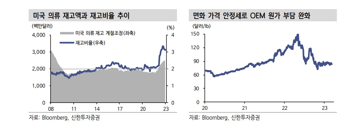 – 지난해 말~올해 초 미국 패션 소비 호조, 재고율 정점 조짐, 영원무역 주목 등으로 의류 OEM에 대한 시장의 관심이 높아질 전망이다.