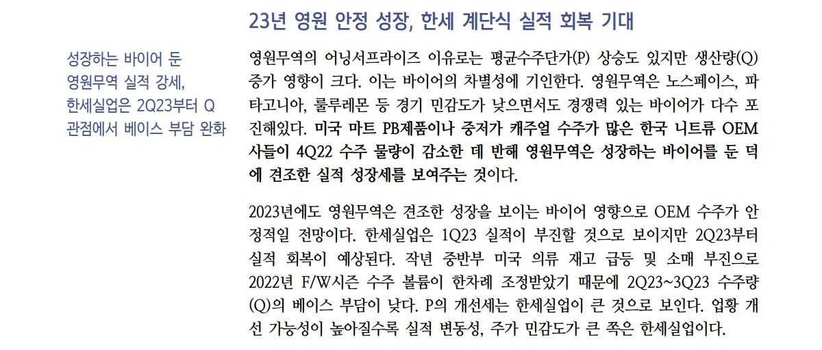 영원무역의 안정적 성장 2023년, 한세실업은 계단식 실적 회복 기대
