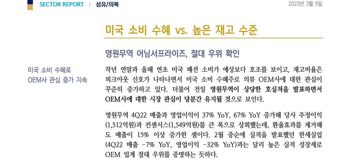 – 2월 중순 실적을 발표한 한세실적(4Q22 매출액 -7% yoy, 영업이익 -32% yoy)과는 달리, OEM 산업의 절대강자는 실적 업체의 성장임이 증명됨