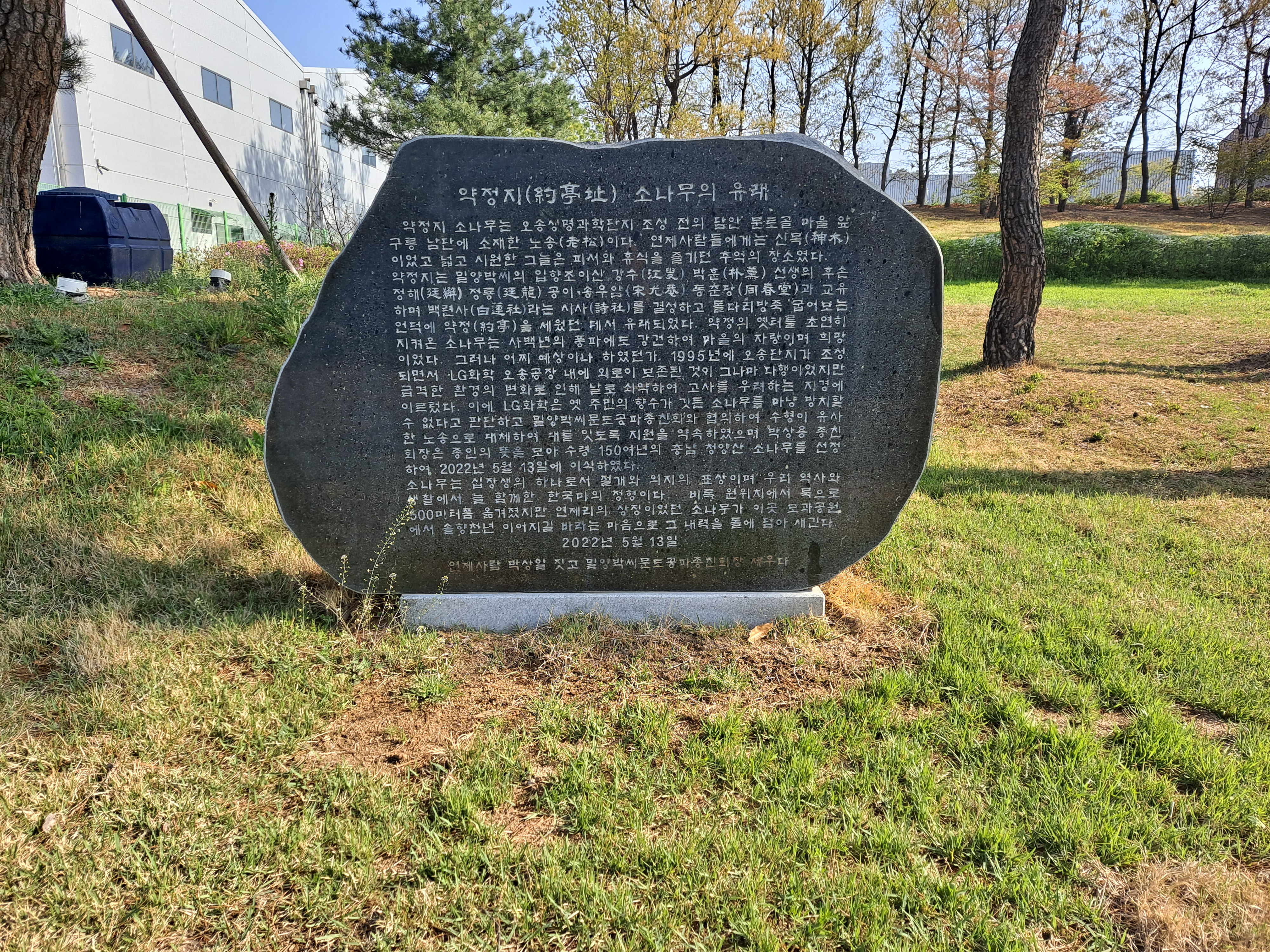 약속의 옛터를 꿋꿋이 지켜온 소나무는 400년의 풍파를 이겨낸 마을의 자랑이자 희망이었다. 그러나 어떻게 그것을 예측할 수 있었습니까? 1995년 오송 단지가 들어서면서 LG화학 오송공장에 홀로 보존돼 다행이었지만 급격한 환경 변화로 날이 갈수록 약해져 폐사 위기에까지 이르렀다. 이에 LG화학은 노년의 향수가 고스란히 담긴 소나무를 방치할 수 없다고 판단하고, 밀양박가족회와 나무 모양이 비슷한 노송으로 교체하기로 합의하고 계승 지원을 약속했다. 2022년 5월 13일 충청남도 청양산의 150년생 소나무를 선별하여 이식하였다.