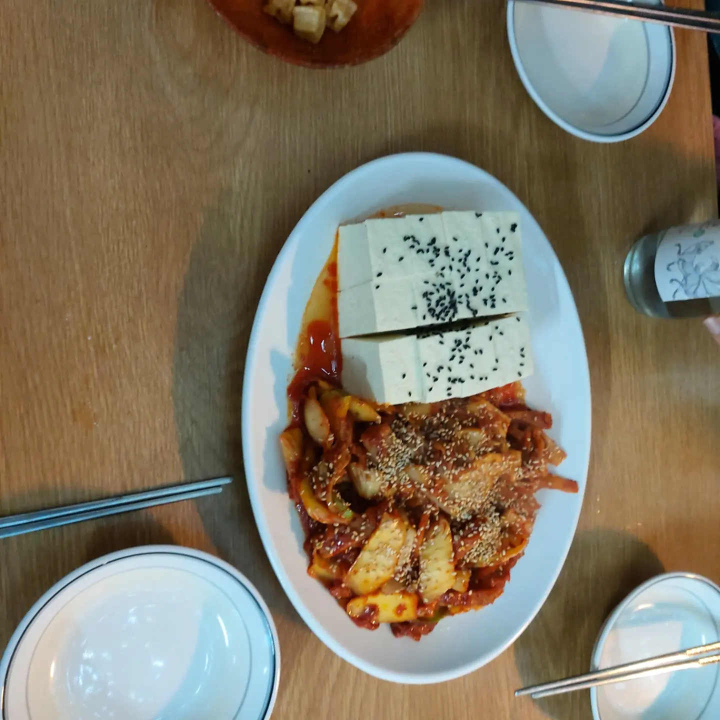 돼지껍데기를 두부김치에 볶고 맥주를 뿌린 후 소주로 전환
