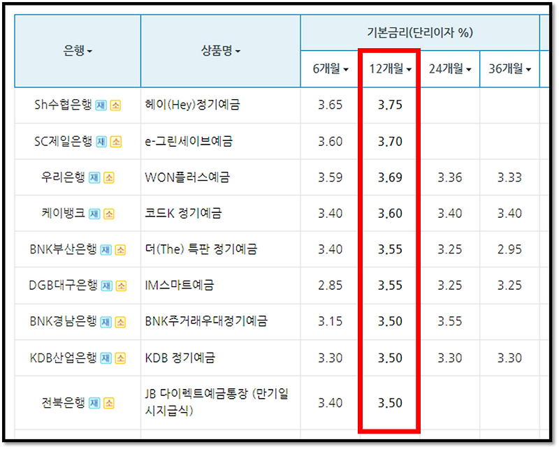 ☆☆긴급수정☆☆케이뱅크의 코드K 정기예금은 연 3.8%로 6월 7일부터 인하되었습니다. 6월 정기예금 금리 비교 자료의 첫 번째는 역시 기본이율입니다. 주기적으로 예금 이율을 비교하고 있는데 전달과 비교하면 이번 달에는 소폭 상승한 은행들이 보이네요. 우대조건을 충족하지 못한 12개월 만기 기본금리 기준 4.0%가 제공되는 예금까지 확인할 수 있습니다.여전히 12개월 만기가 24개월, 36개월보다 높은 수준이네요.