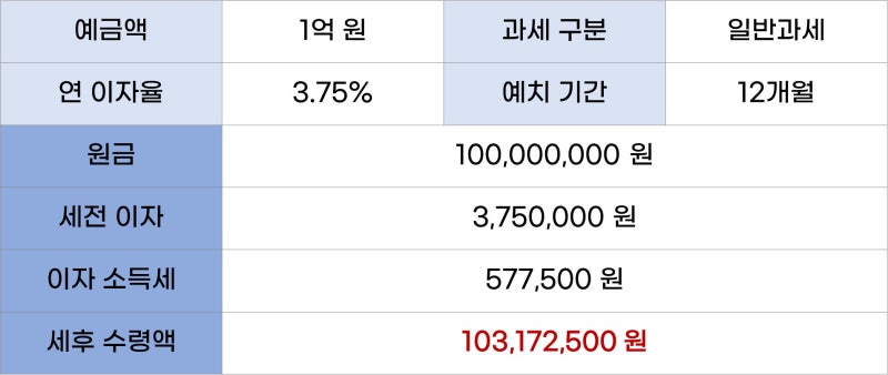 연 4.0%(12개월 만기 기준) 이율을 가정할 경우 만기 시 예상 세후 수령액을 계산해 보겠습니다. 어디까지나 예상 금액이므로 오차가 발생할 수 있습니다.그리고 아마 당연하지만 이자소득세 분리과세를 상정했습니다. 만약 금융소득 종합과세 대상이라면 세금 계산이 다르므로 주의하시기 바랍니다.아마 게시물을 확인하시는 분들은 보통 5천만원에서 1천만원 정도 예금을 고려하고 있는 것 같고, 아래 예금액을 가정해서 계산했습니다.예상 세후 수령액 계산은 간단히 가능하오니 아래 자료는 몰래 참고용으로만 보셔도 됩니다.