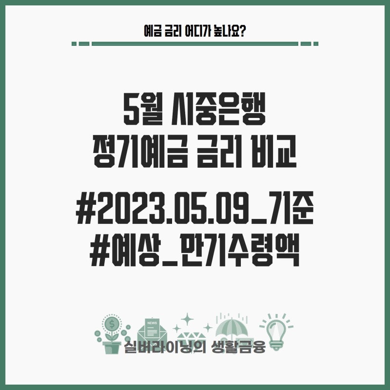 매번 그렇지만 정기예금 금리 비교 결과는 정말 허무하기도 해요. 크게의미있는자료가아니다라는뜻입니다. 그래도 꾸준히 보고 활용하시는 분들도 계신 것 같아서 지속적으로 업데이트는 할 예정입니다.아까 잠깐 언급은 했지만 매월 20일이 조금 지나서 대대적으로 대부분의 저축상품 이율이 업데이트되는 추세인 것 같네요. 그때 다시 한번 볼게요.아래는 같이 봐두면 좋은 글을 몇 개 첨부했습니다.1개월 만기 정기예금 이율 비교(23.05.15 기준) 1억원 모으는 데 드는 시간 금융소득종합과세 예상세금과 건보료